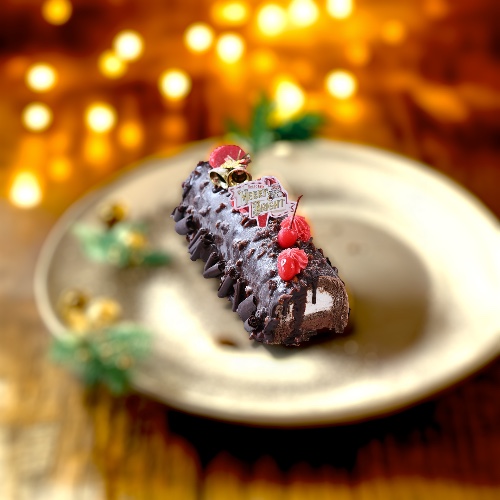 Indulge in the luxurious taste of our Black Forest Log, a rich chocolate yule log that brings a classic German dessert to your festive table. A decadent twist on the classic yule log. Deep, dark chocolate sponge rolled with silky chocolate ganache, layered with tart black cherries and a whisper of kirsch. Finished with a bark-like cocoa glaze, forest berries, and chocolate shavings—rich, elegant, and unmistakably Black Forest.